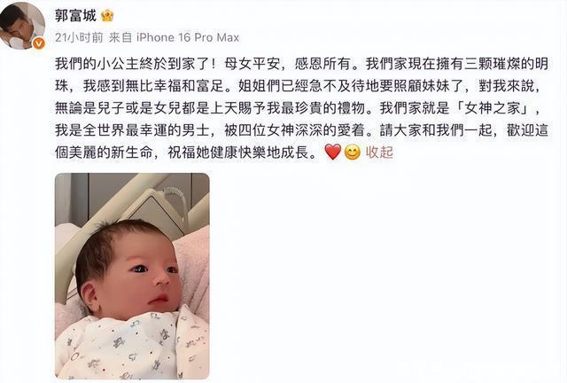 但这种说法很快就被郭天王给否认了,他发文表示,不管是儿子还是女儿,于他而言都是珍贵的礼物,能被四个女神深爱,他觉得自己很幸运。 言语之间,能感受到郭富城为人父的激动和欢喜,看不到任何失落与不满。